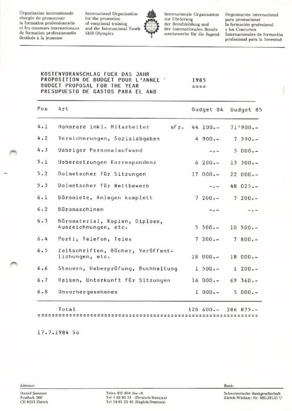 - Document dated in 17/07/1984 outlining the IVTO budget proposal for 1985, including projected expenses for staff, insurance, translations, interpreters (meetings and competitions), office rent and materials, communications, publications, taxes, travel, and contingencies. Compares 1984 and 1985 figures, showing a total increase from 128,600 to 286,875.