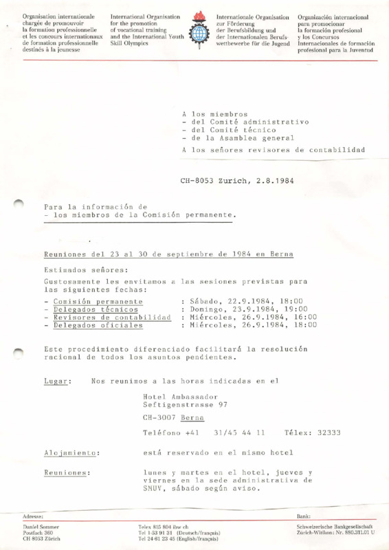 - Letter from Daniel Sommer to the Administrative Committee, Technical Committee, General Assembly, Auditors, and Standing Committee, 02/08/1984 (ES)