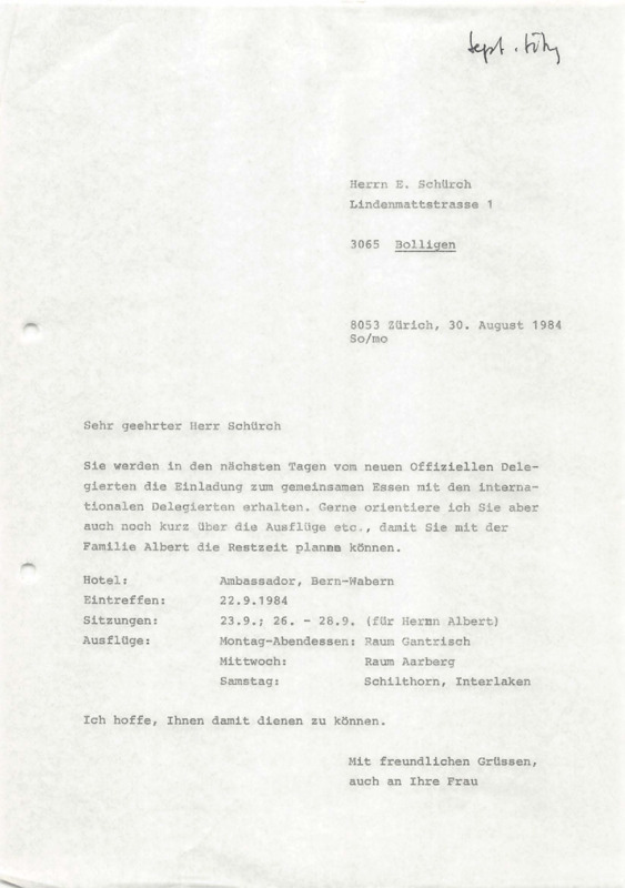 - Letter to E. Schürch, 30/08/1984