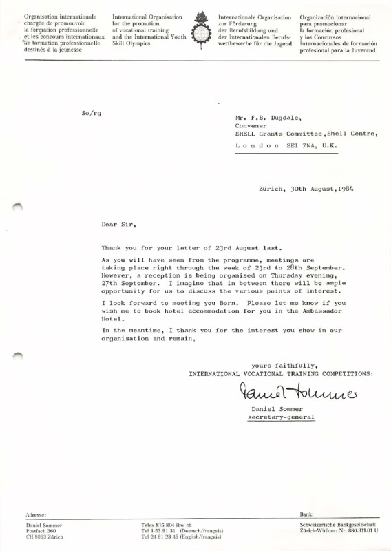 - Letter from Daniel Sommer to F. B. Dugdale (Convener, Shell Grants Committee), 30/08/1984