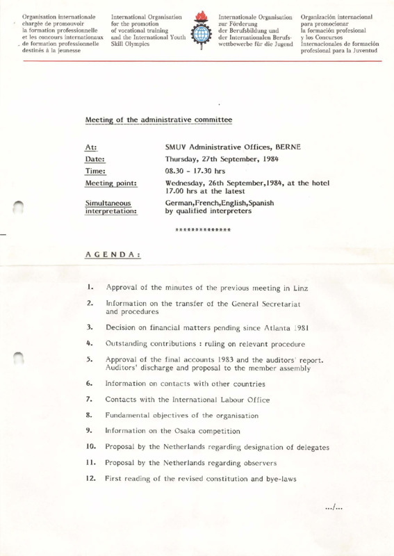 - Administrative Committee meeting agenda, Bern 27/09/1984 (EN)