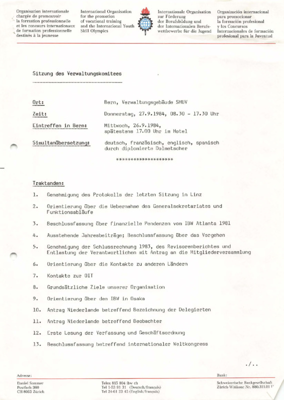 - Agenda including approval of Linz minutes, Secretariat transfer, financial matters since Atlanta 1981, 1983 accounts and auditors’ report, international contacts and ILO, Osaka competition, Netherlands proposals, revised constitution, World Congress, honorary members, badges, publications, President Albert’s report, 1985 budget, 1985 calendar, and miscellaneous.