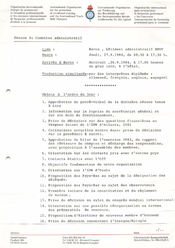 - Agenda including approval of Linz minutes, Secretariat transfer, financial matters since Atlanta 1981, 1983 accounts and auditors’ report, international contacts and ILO, Osaka competition, Netherlands proposals, revised constitution, World Congress, honorary members, badges, publications, President Albert’s report, 1985 budget, 1985 calendar, and miscellaneous.