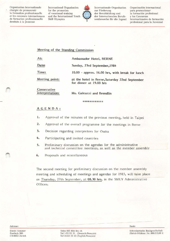 Standing Commission meeting agenda, Berne 23/09/1984 (EN)