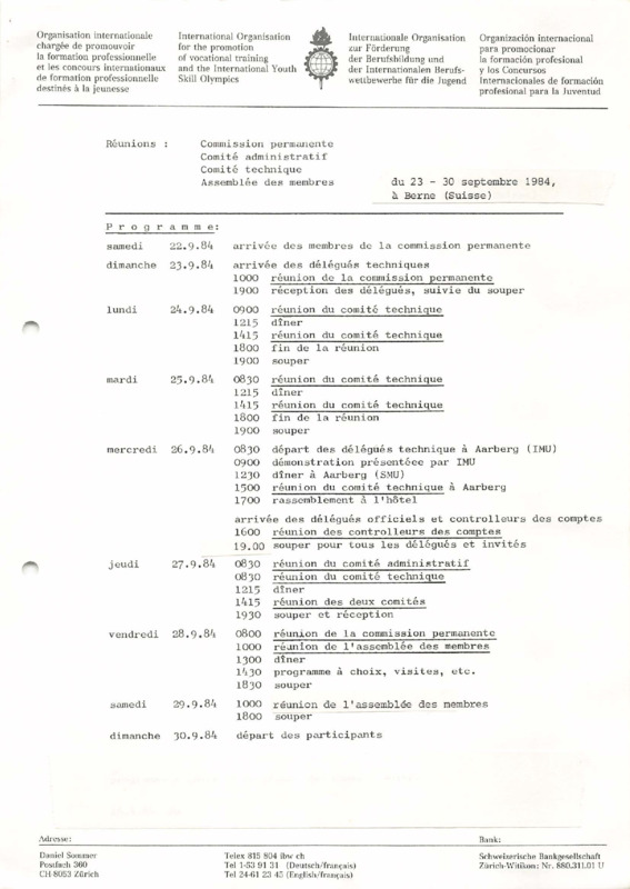 - Description: Programme of meetings held in Berne, Switzerland, from 23 to 30 September 1984. Includes schedules for the Standing Commission, Administrative Committee, Technical Committee, and General Assembly, with detailed daily agendas such as receptions, committee sessions, auditors’ meeting, and optional visits.