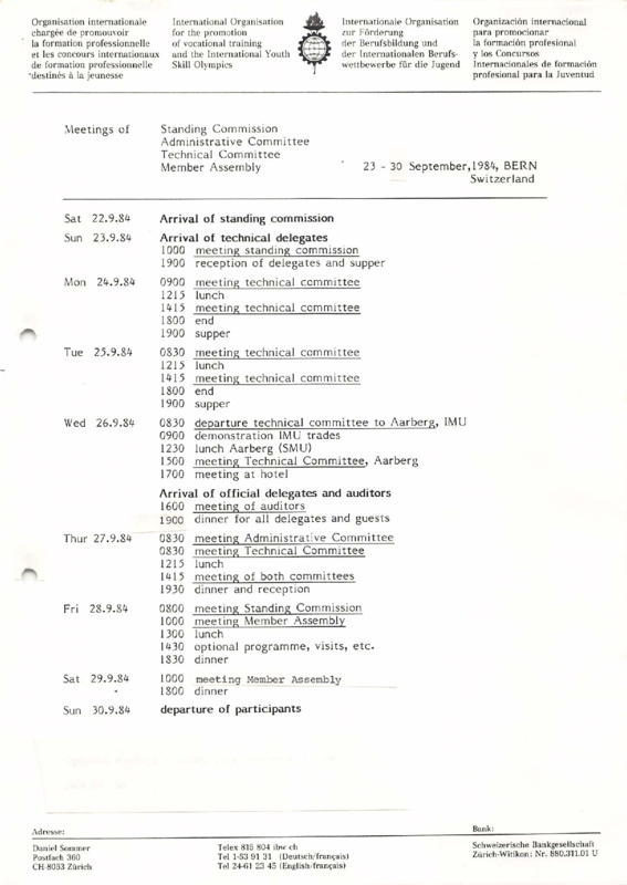 - Programme of meetings held in Berne, Switzerland, from 23 to 30 September 1984. Includes schedules for the Standing Commission, Administrative Committee, Technical Committee, and General Assembly, with detailed daily agendas such as receptions, committee sessions, auditors’ meeting, and optional visits.