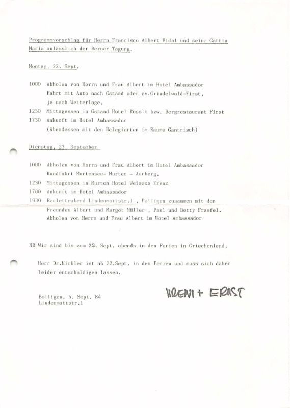 - Programme schedule for Francisco Albert Vidal and his wife, Berne 22–23/09/1984 (DE)