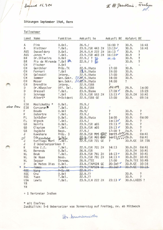 - List of participants for meetings, Berne September 1984