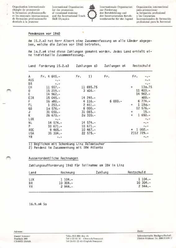 - Includes amounts outstanding before 1983, payments made in 1983 and 1984, and final balances. Also details extraordinary invoices related to the 1983 competition in Linz, showing amounts received, outstanding, and related notes.