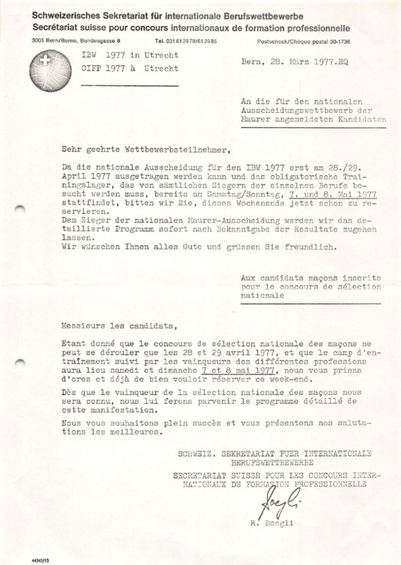 - Letter from the Swiss Secretariat for International Vocational Training Competitions to Competitors registered for the national bricklaying selection competition, 28/03/1977