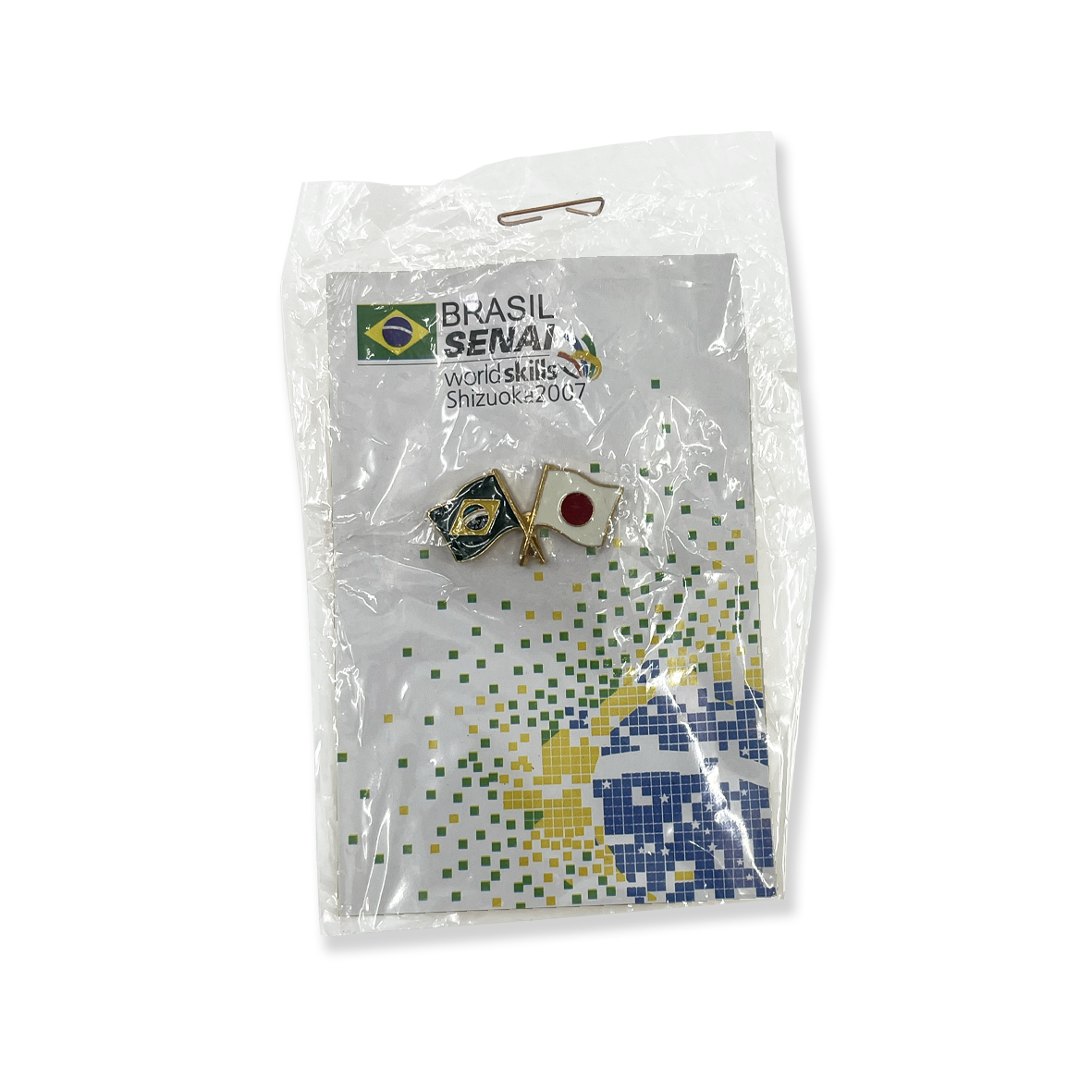 - Pin showing crossed flags of Brazil and Japan, produced for WorldSkills Shizuoka 2007. Distributed by SENAI Brazil as part of promotional and exchange activities. This example remains sealed in its original packaging.