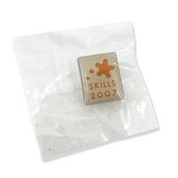 - Rectangular pin with orange graphic design and the text “Skills 2007.” Produced as official merchandise for WorldSkills Shizuoka 2007 in Japan. This example remains sealed in its original packaging.
