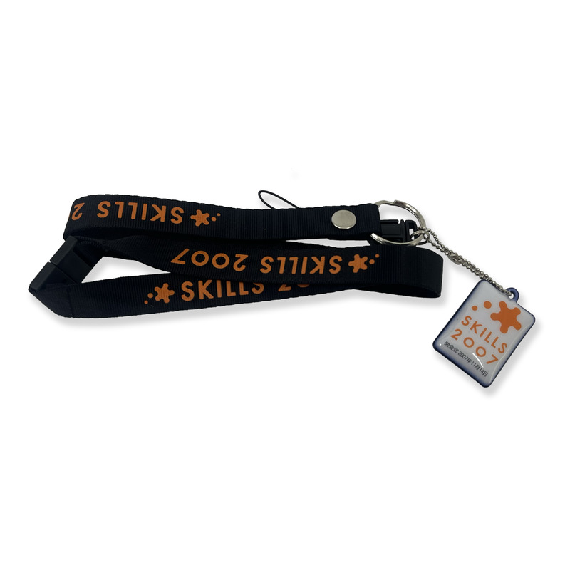 - Black lanyard printed with the text “Skills 2007” in orange, accompanied by a rectangular keychain tag featuring the same design and event date. Produced as official merchandise for WorldSkills Shizuoka 2007.
