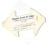 - Voucher card for the “Olimpiada Juvenil del Trabajo” festival in Calle Corrida, Gijón, on 6 September 1962, entitling the bearer to goods at Café Alcázar.