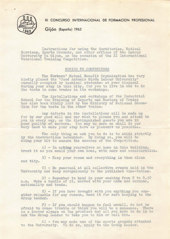 - Instructions for accommodation and services, 11th International Vocational Training Competition, Gijón 1962