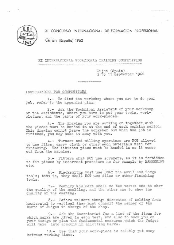 - Instructions for Competitors, 11th International Vocational Training Competition, Gijón 1962