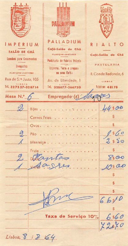 - Bill from cafés and tea rooms in Lisbon (Imperium, Palladium, Rialto)
