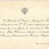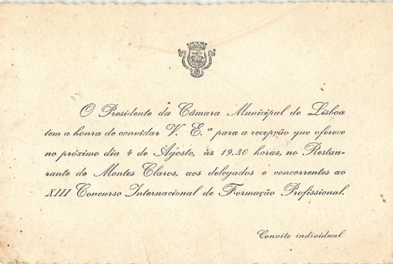 - Invitation from the President of the Lisbon City Council to a reception on 4 August 1964 at the Montes Claros restaurant for Delegates and Competitors of the 13th International Vocational Training Competition.