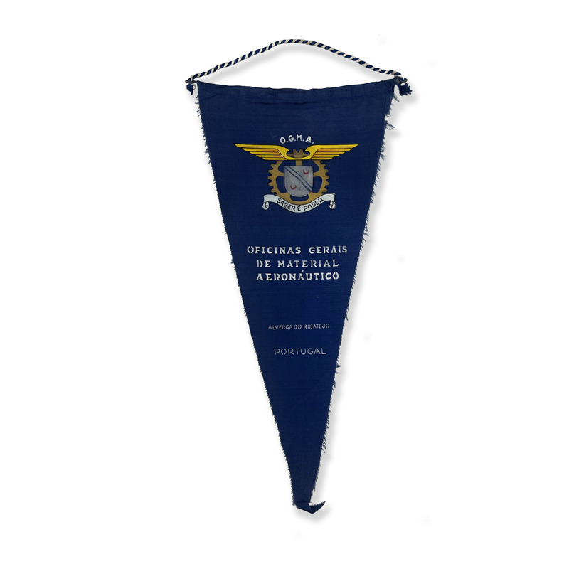 - Blue cloth pennant with the emblem of OGMA (Oficinas Gerais de Material Aeronáutico), including the motto “Saber e Fazer.” Inscribed with “Oficinas Gerais de Material Aeronáutico – Alverca do Ribatejo – Portugal.”