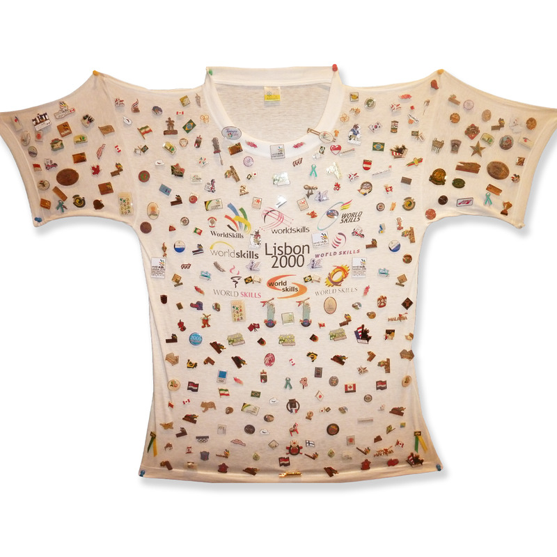 - WorldSkills visual identity competition - T-shirt featuring contest finalists, covered with numerous WorldSkills and national pins from different countries and editions.