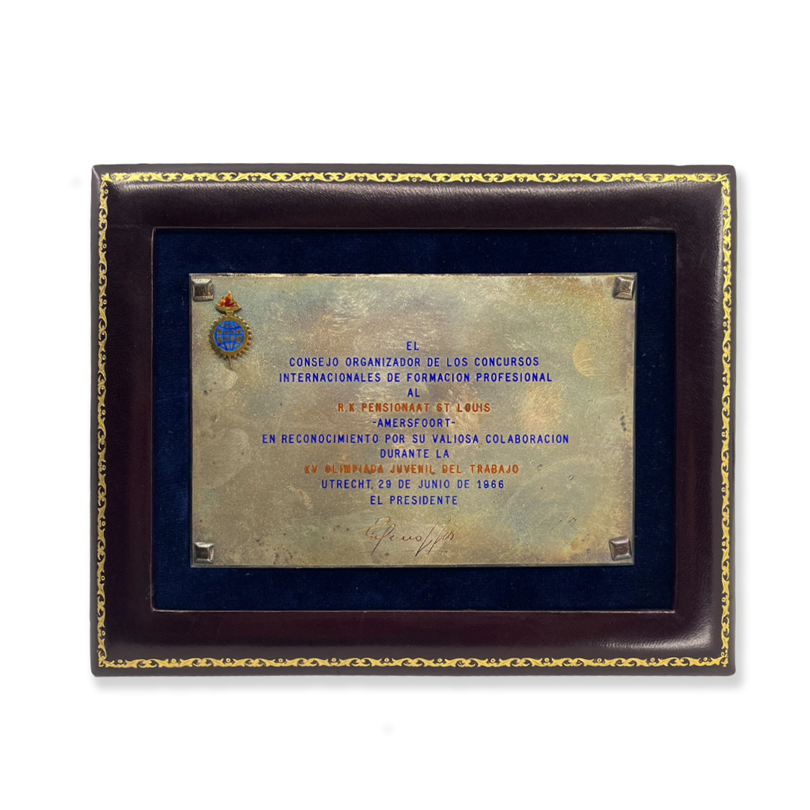 - Commemorative plaque presented by the Organizing Committee of the International Vocational Training Competitions to R.K. Pensionaat St. Louis Amersfoort, in recognition of its valuable collaboration during the 15th International Vocational Training Competition. Dated Utrecht, 29 June 1966, signed by the President. The plaque is mounted in a decorative frame with gilded border.