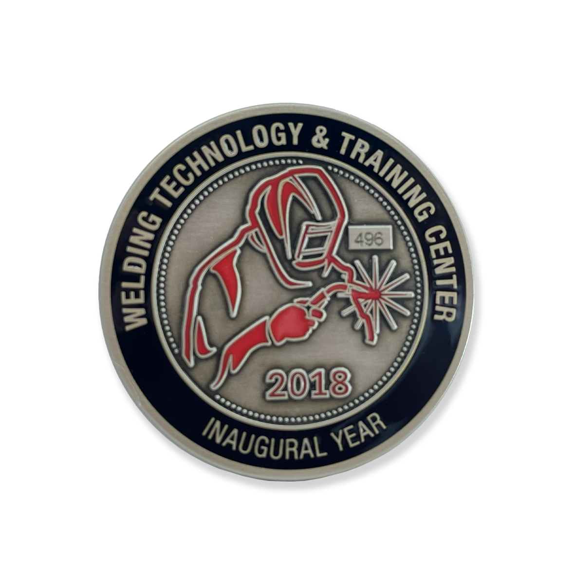 - Round commemorative medal with two different designs on each side. One side shows a welder in protective gear with torch, surrounded by the inscriptions “WELDING TECHNOLOGY & TRAINING CENTER,” “2018,” and “INAUGURAL YEAR,” including a serial number “496.” The reverse side marks the centenary of the Lincoln Electric Welding School (1917–2017), with the inscription “100 YEARS.”