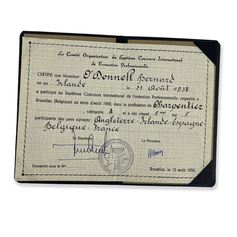 - Fifth place certificate to Bernard O’Donnell in Joinery, 7th International Vocational Training Competition, Brussels 1958