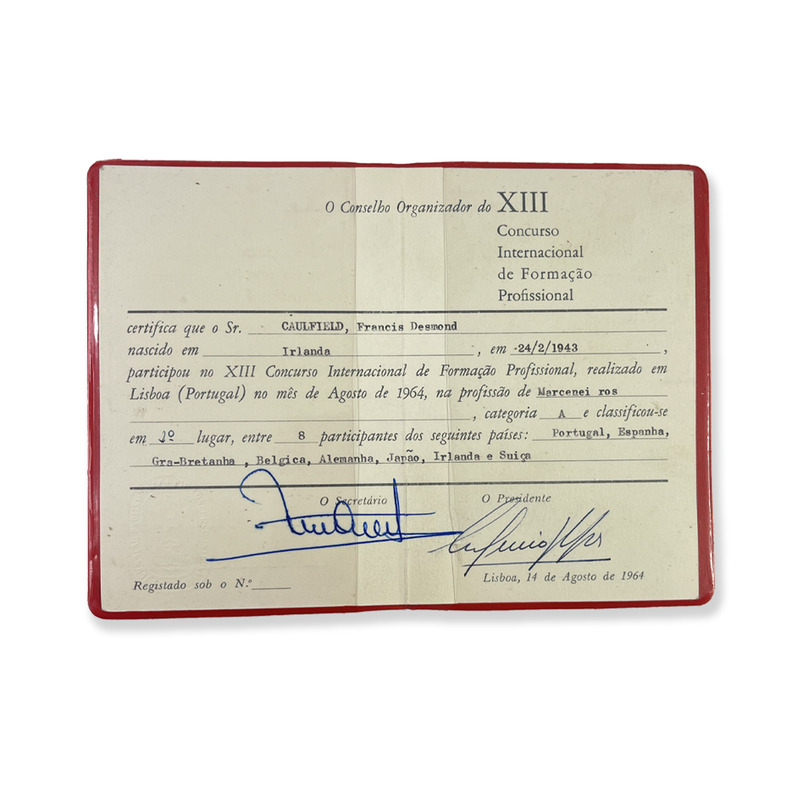 - Second place certificate to Francis Desmond Caulfield in Cabinetmaking, 13th International Vocational Training Competition, Lisbon 1964