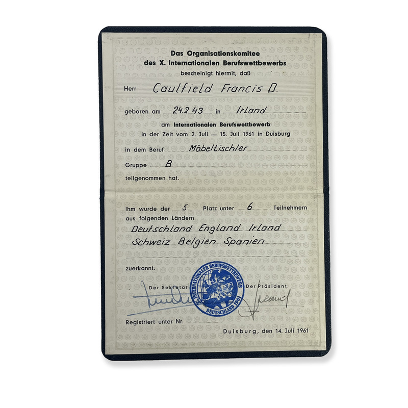 - Fifth place certificate to Francis Desmond Caulfield in Cabinetmaking, 10th International Vocational Training Competition, Duisburg 1961