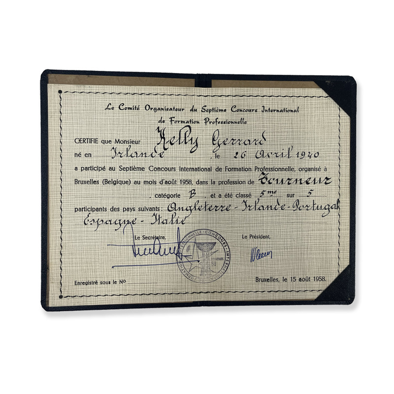 - Fifth place certificate to Gerrard Kelly in Turning, 7th International Vocational Training Competition, Brussels 1958