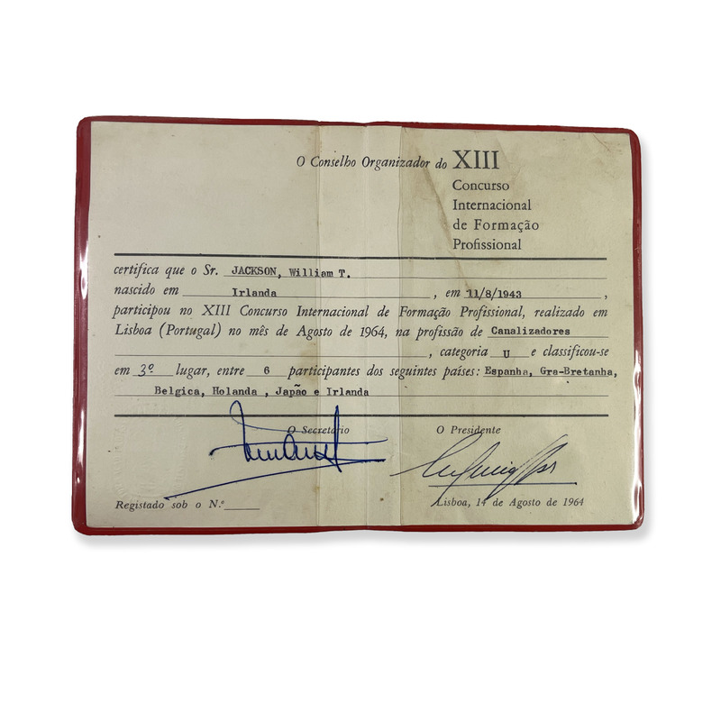 - Third place certificate to William Thomas Jackson in Plumbing, 13th International Vocational Training Competition, Lisbon 1964