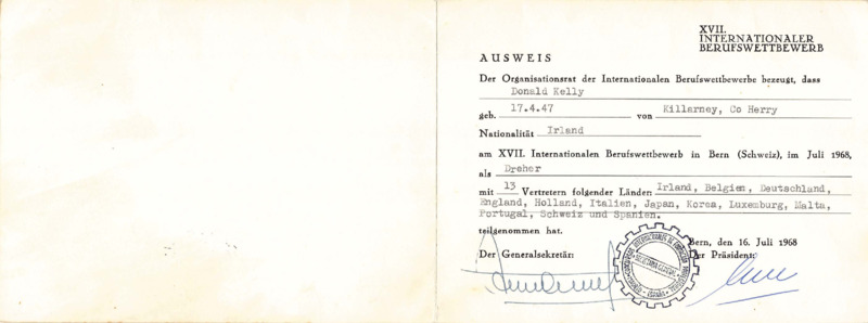 - Certificate of participation to Donald Kelly in Turning, 17th International Vocational Training Competition, Bern 1968