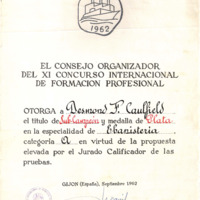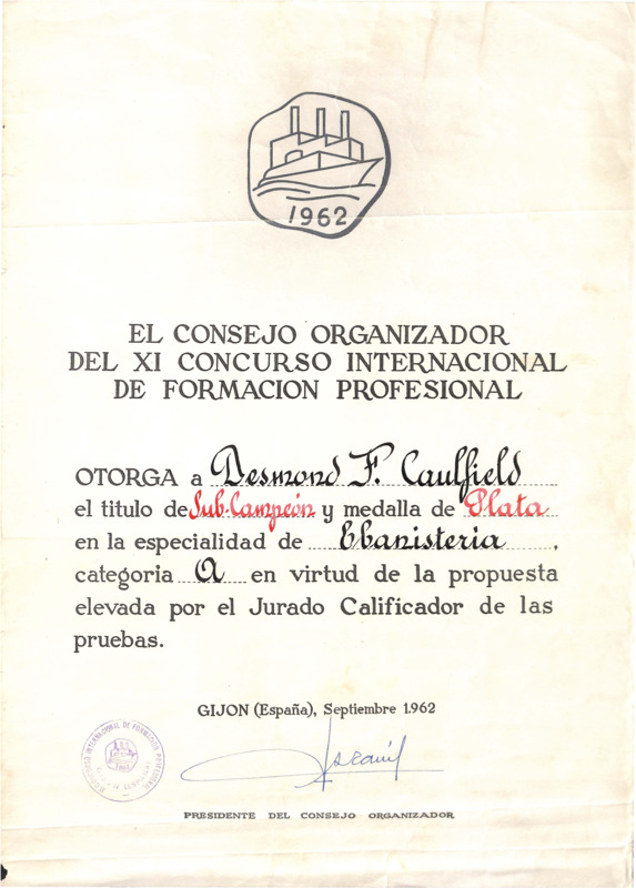 - Silver medal certificate to Desmond F. Caulfield in Cabinetmaking, 11th International Vocational Training Competition, Gijón 1962