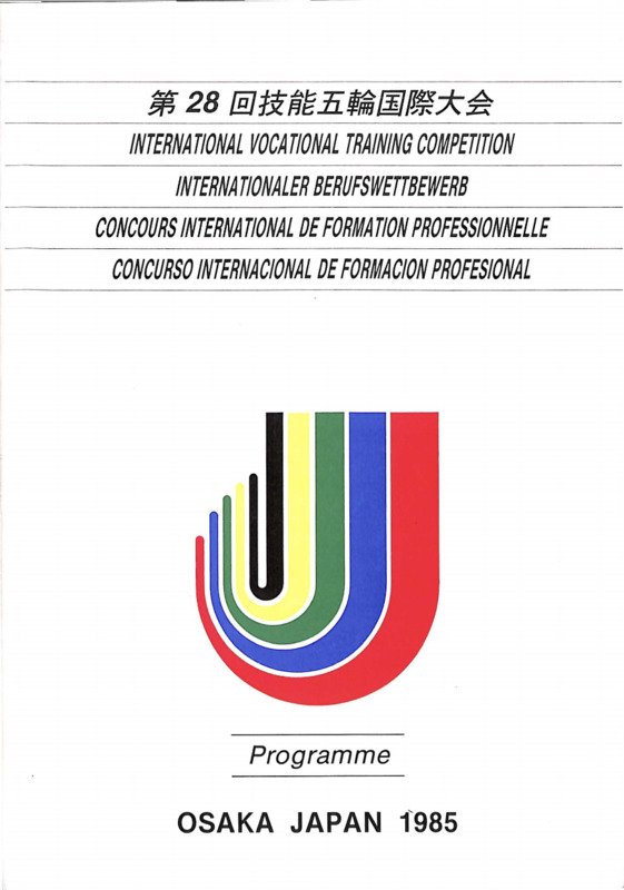 - Handbook containing the official programme of the 28th International Vocational Training Competition held in Osaka, Japan, from 14 to 28 October 1985. It includes welcome messages from Francisco Albert and Shigeichi Koga, a detailed daily schedule of events and meetings, information for participants, lists of competition venues, trades, and members, as well as floor plans and enrolment tables.