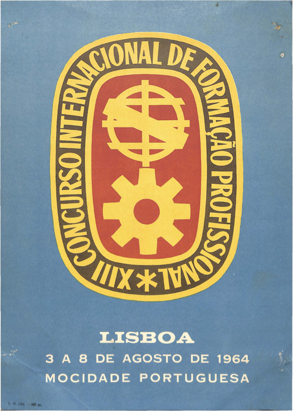 - Printed poster announcing the 13th International Vocational Training Competition held in Lisbon, Portugal, from 3 to 8 August 1964. The design features the event’s emblem