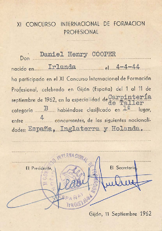 - Third place certificate to Daniel Henry Cooper in Joinery, 11th International Vocational Training Competition, Gijón 1962
