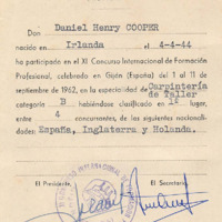 - Third place certificate to Daniel Henry Cooper, 11th International Vocational Training Competition, Gijón 1962