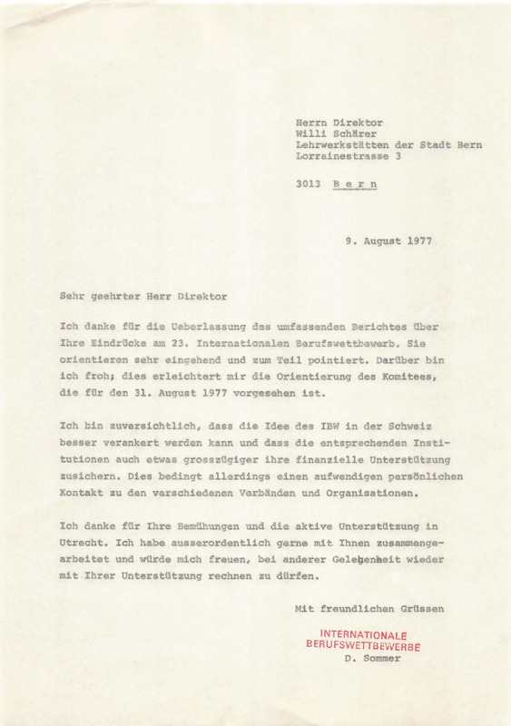 Subject: Appreciation for the detailed report on impressions from the 23rd International Vocational Training Competition, Utrecht 1977; intention to use it for briefing the Committee; expresses optimism about strengthening IBW’s position in Switzerland and thanks for cooperation and support in Utrecht. - Date