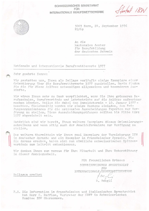 - Letter from the Swiss Secretariat for International Vocational Competitions to the cantonal offices for vocational education (German-speaking Switzerland), 21/09/1976
