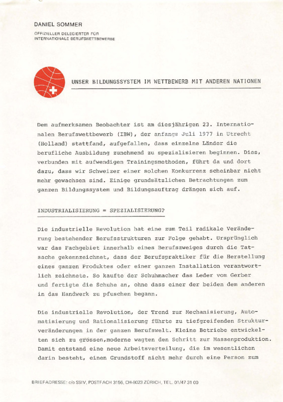 - Article by Daniel Sommer, reflecting on the challenges observed at the 23rd International Vocational Training Competition, Utrecht 1977. It discusses the increasing specialization and intensive training methods in some countries, contrasts them with the Swiss vocational education model, and examines the effects of industrialization, mechanization, and automation on professional structures and education.