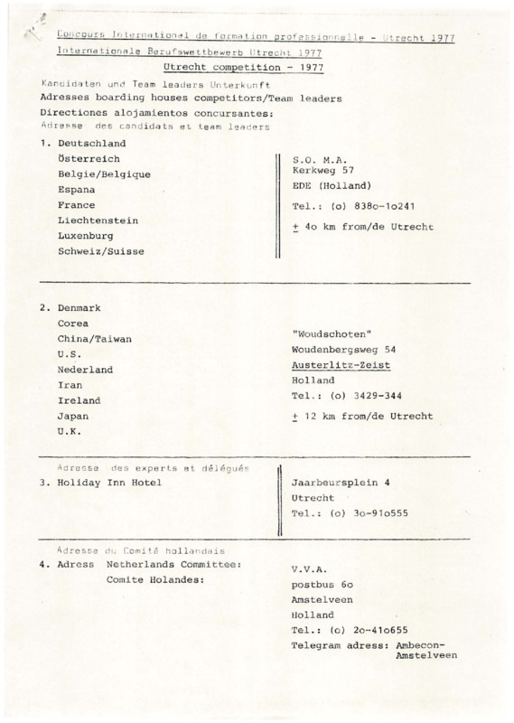 - Accommodation addresses for Competitors and Team Leaders, 23rd International Vocational Training Competition, Utrecht 1977