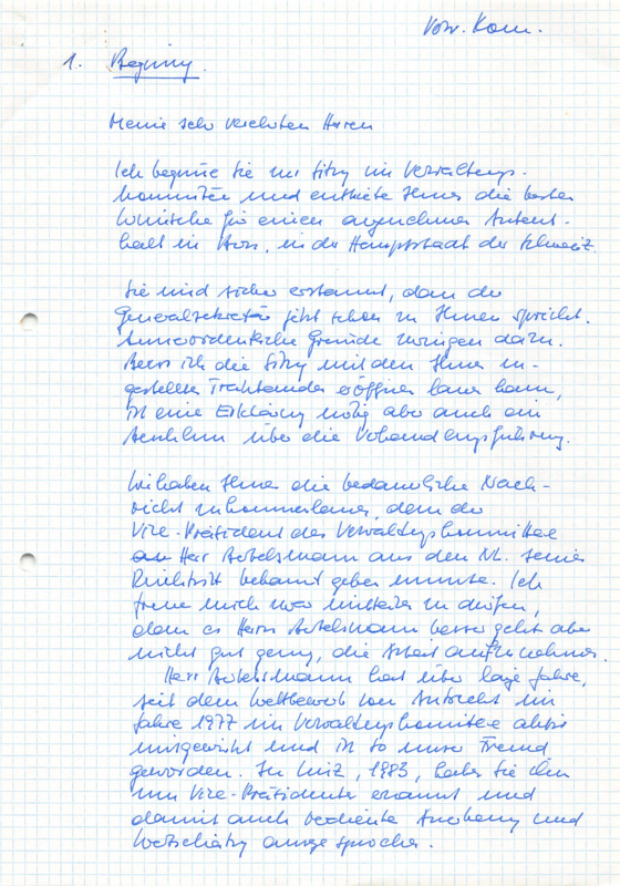 - Handwritten draft by René Gonthier, prepared on squared paper for the Technical Committee meeting held in Berne in 1984. The text serves as a draft of his introductory address, including a welcome on behalf of Switzerland, references to organizational matters, and a tribute to Vice-President Bodelmann (Germany), who had resigned earlier that year. The draft further comments on Committee coordination, leadership transitions, and participation of national representatives from several countries.