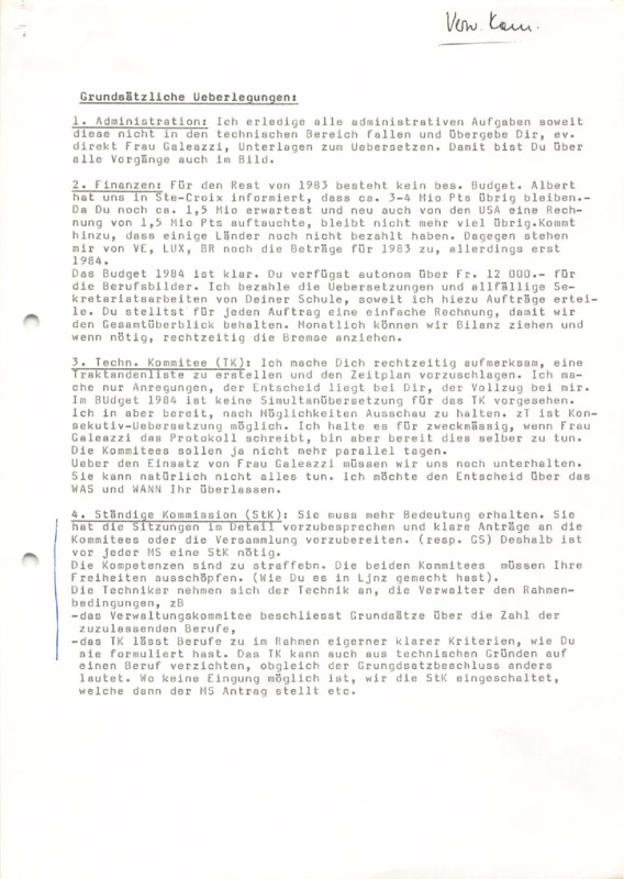 - Typed memorandum written by René Gonthier, outlining administrative, financial, and organizational guidelines for 1984 following the 27th International Vocational Training Competition. The document specifies responsibilities regarding administration, translation, and secretarial tasks, financial management for 1983–1984, and budgeting details. It also addresses procedures for the Technical Committee and Standing Committee, emphasizing better coordination, clearer mandates, and preparation of agendas and reports.