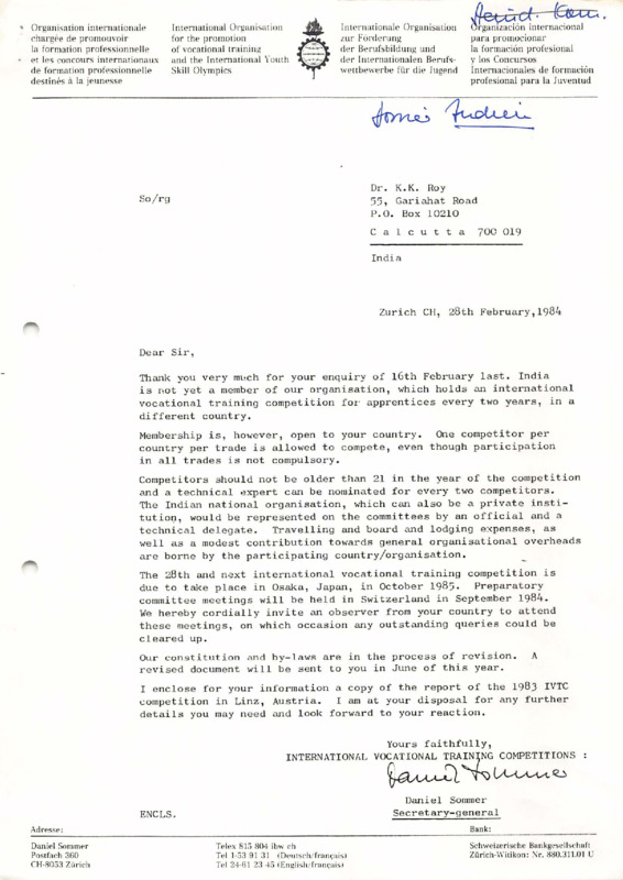 - Letter from Daniel Sommer to Dr. K. K. Roy, 28/02/1984 (EN)