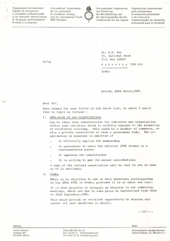 Subject: Response to questions from India regarding admission requirements for new Member organisations and possibilities for observer participation at the 28th International Vocational Training Competition, Osaka 1985 - Date
