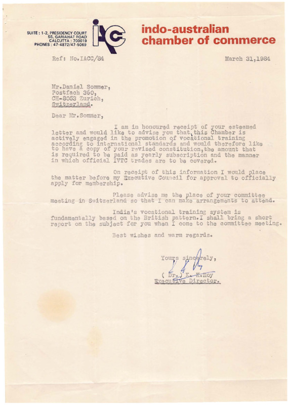 Letter from Daniel Sommer to Dr. K. K. Roy, 1984 (DE) |