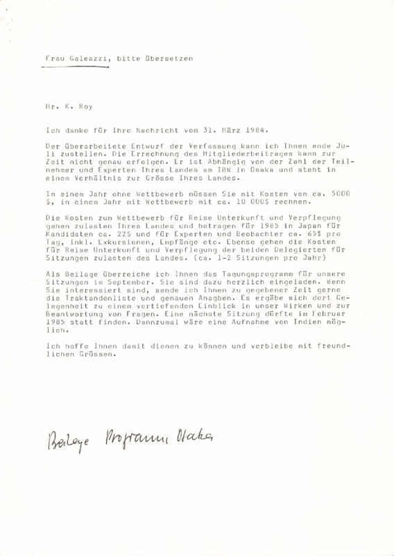 Letter from Daniel Sommer to Dr. K. K. Roy, 1984 (DE) |