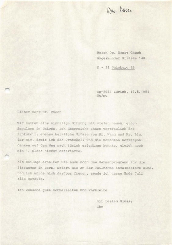 - Letter from Daniel Sommer to Dr. Ernst Chech, 17/01/1984