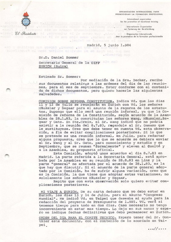 Subject: Observations on the July constitutional reform meetings, clarification of Commission membership, travel dates to Zurich, and pending Technical Committee agenda - Date