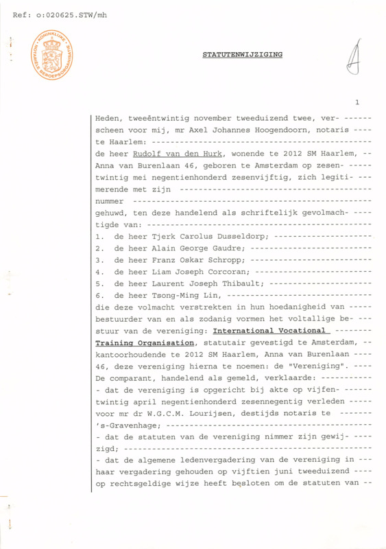 - Notarial deed executed before Mr. Axel Johannes Hoogendoorn in Haarlem, recording the amendment of the Articles of Association of the International Vocational Training Organisation. The act identifies Rudolf van den Hurk as the appearing party acting under powers of attorney granted by all Executive Board members (listed on page 1). It records the General Assembly resolutions authorizing the amendments and establishes the revised text of key articles, including the new name “WorldSkills (International Vocational Training Organisation)” and updated mission, purpose, and implementation provisions. The notarized act also notes procedural requirements, attachment of meeting minutes, and confirmation of proper authorization.